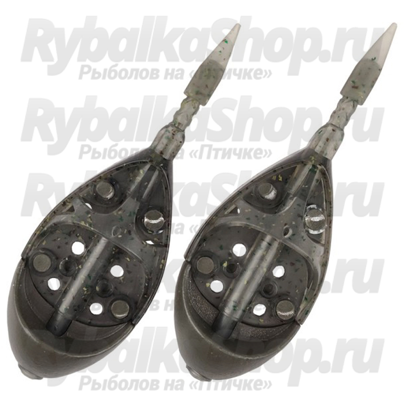 - In-Line конструкция. Леска проходит сквозь кормушку. Благодаря этому повышается чувствительность снасти. Также In-line безопасен для рыбы. При обрыве кормушка слетает с лески.