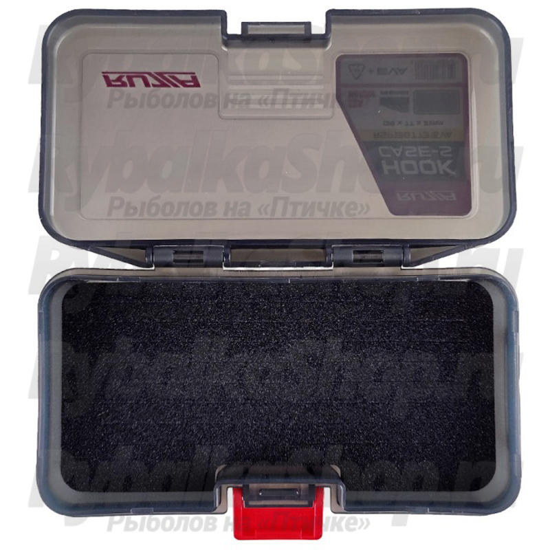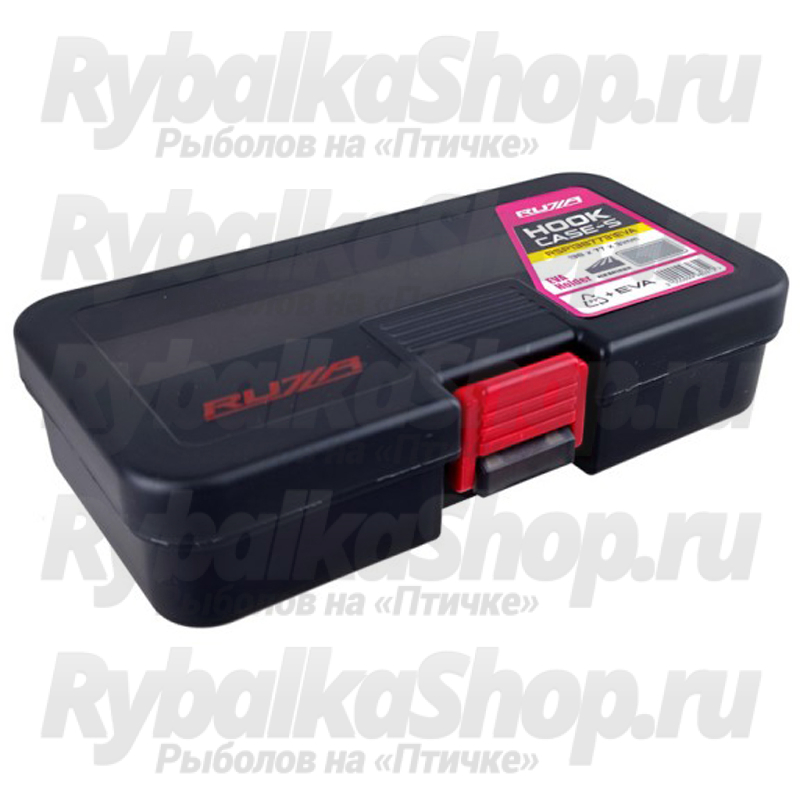 Односторонняя коробка Ruzza из ударопрочного армированного пластика PP (полипропилен). Отсек снабжен плотной вспененной подложкой из EVA (этиленвинилацетат) с прорезями для надёжного хранения крючков и некрупных приманок.