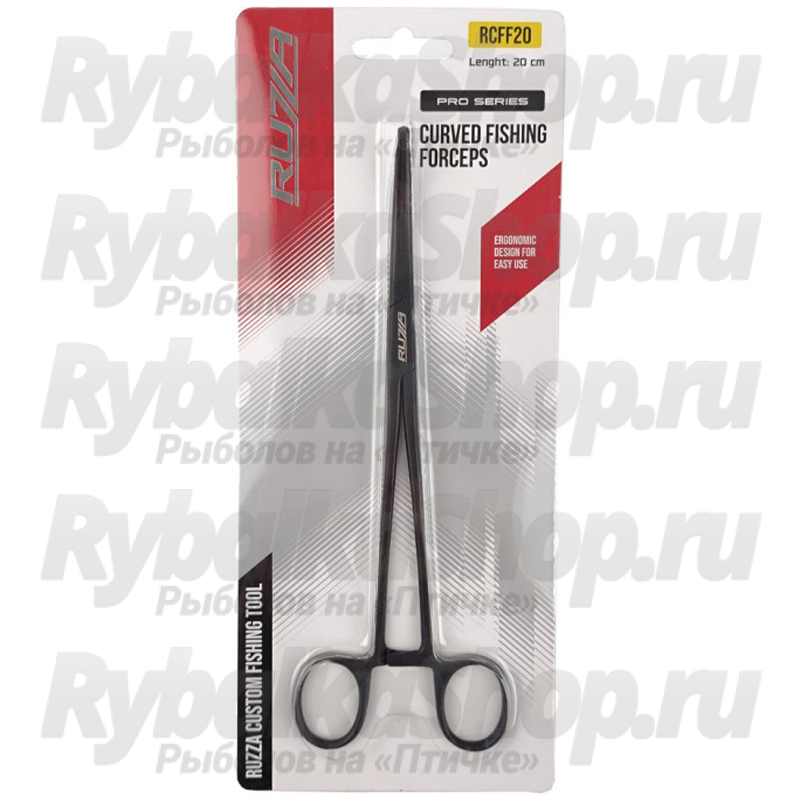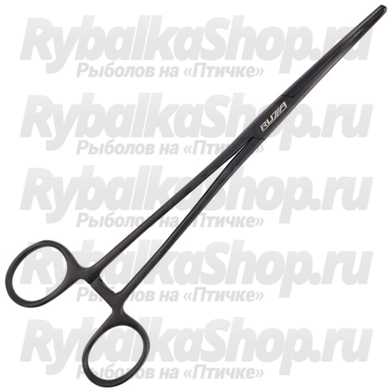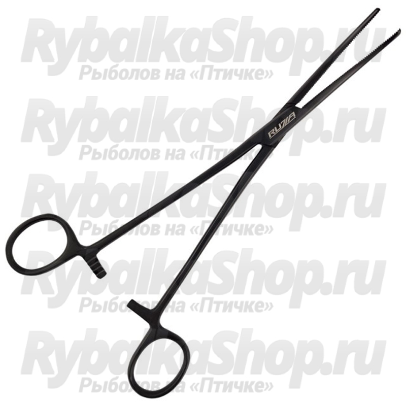 Зажим рыболовный (корнцанг) Ruzza для извлечения крючков из пасти рыбы. Имеет отогнутые в сторону губки и многопозиционный фиксатор, удерживающий зажим в закрытом положении. Рыболовный зажим изготовлен из высококачественной нержавеющей стали с тефлоновым покрытием.
