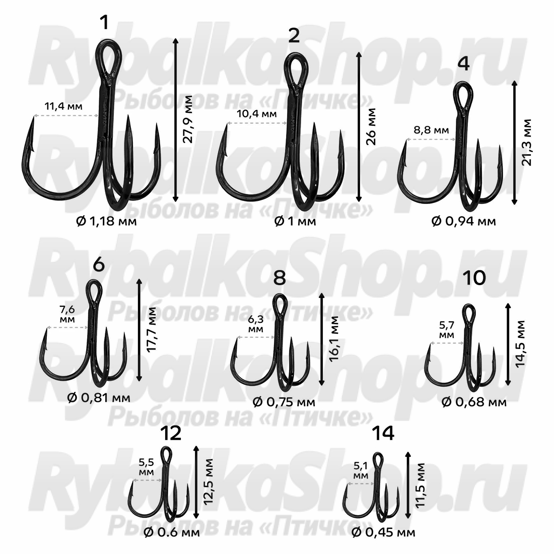CF T hook - качественные тройные крючки для оснащения различных приманок. Надежность и острота крючков достигается благодаря современному процессу производства и вниманию к деталям. Широкий размерный ряд позволяет подобрать оптимальный вариант под любые условия ловли.