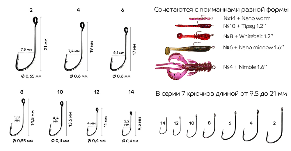 Тонкая проволока и надежная заточка. Острое жало S hook надежно пробивает губу рыбы даже во время аккуратных поклевок, а тонкая проволока надежно зафиксирует рыбу и не даст ей сойти. Это самые тонкие наши крючки, диаметр проволоки в нано-размерах начинается всего от 0.38 мм!