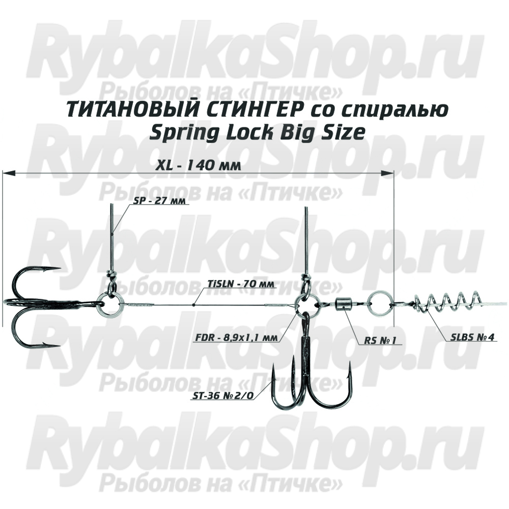 Готовая оснастка-стингер титановый со спиралью Vido Craft Spring Lock Big Size (VD-TiSL) идеально подходит для силиконовых приманок средних и крупных размеров. Данная оснастка состоит из 2 качественных крючков-тройников, соединенных проволочным каркасом, спирали, вертлюга, заводных колец и шипов, служащих для фиксации стингера и его составляющих элементов в теле крупной мягкой приманки.