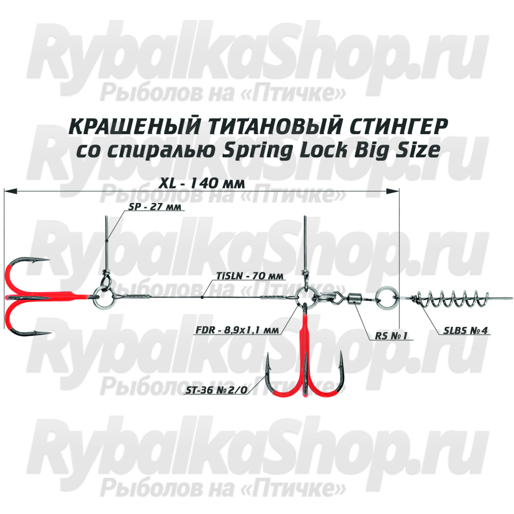 Готовая оснастка-стингер титановый со спиралью Vido Craft Spring Lock Big Size (VD-CTiSL) идеально подходит для силиконовых приманок средних и крупных размеров. Данная оснастка состоит из 2 качественных крючков-тройников, соединенных проволочным каркасом, спирали, вертлюга, заводных колец и шипов, служащих для фиксации стингера и его составляющих элементов в теле крупной мягкой приманки.