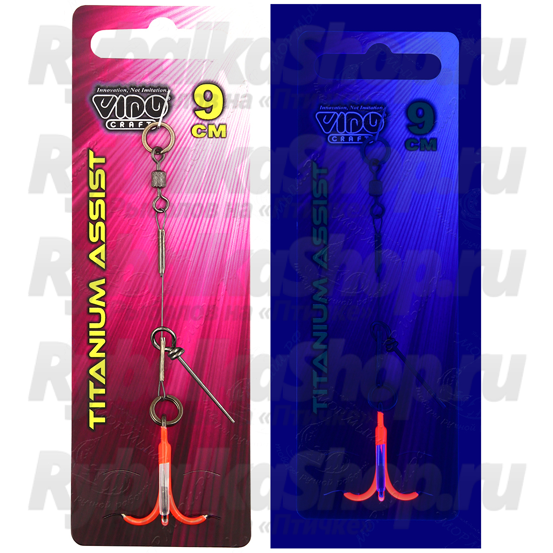 Особенность оснастки Vido Craft Titanium Assist VD-CTiJE в том, что крючок покрыт оранжевой флуоресцентной покраской (светится в ультрафиолете).