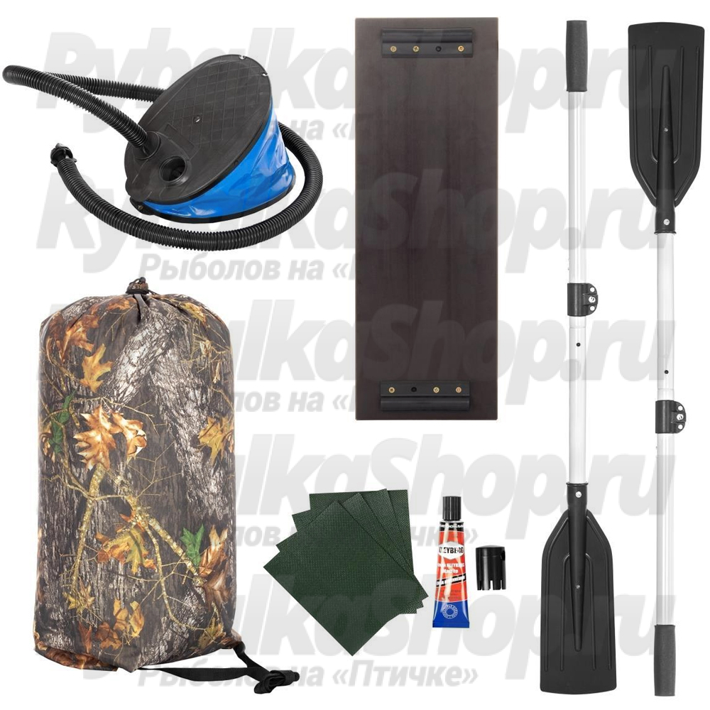 Лодка поставляется со стандартным набором комплектующих: • Ножной насос 3 л. • 2 весла с держателями весла в уключине. • 1 жесткое сиденье. • Сумка-рюкзак для хранения и перевозки. • Ремкомплект и руководство по эксплуатации (паспорт).