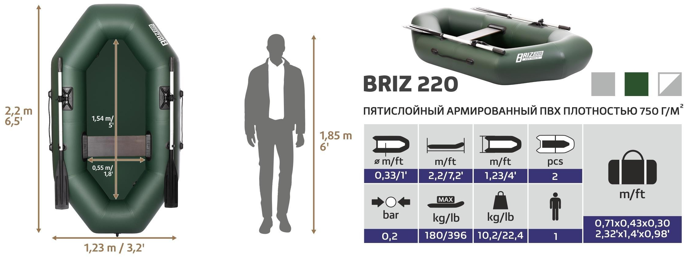 Надувная гребная лодка «БРИЗ 220» производства ГК "ТОНАР" - легкая и компактная одноместная лодка. Корпус лодки выполнен из пятислойного армированного ПВХ и образован баллоном О-образной формы. Баллон разделен перегородками на 2 независимых отсека, что гарантирует безопасность пребывания на воде. На лодке используется современная и надежная фурнитура отечественных производителей. Рекомендованные районы плавания: закрытые акватории, небольшие озера, реки.