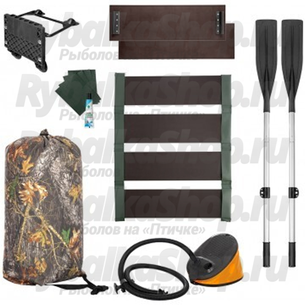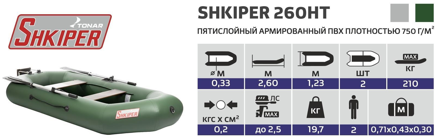Лодка поставляется со стандартным набором комплектующих: • Ножной насос 5 л. • 2 весла с держателями весла в уключине. • 2 жестких сиденья. • Реечная слань. • Навесной транец. • Сумка для хранения и перевозки. • Ремкомплект и руководство по эксплуатации (паспорт). Стандартная комплектация «ШКИПЕР 260 НТ» включает в себя реечный настил, позволяющий уверенно перемещаться в лодке и рыбачить стоя. Небольшой вес, компактность при транспортировке, быстрота и легкость сборки лодки делают ее популярной среди рыбаков и охотников.