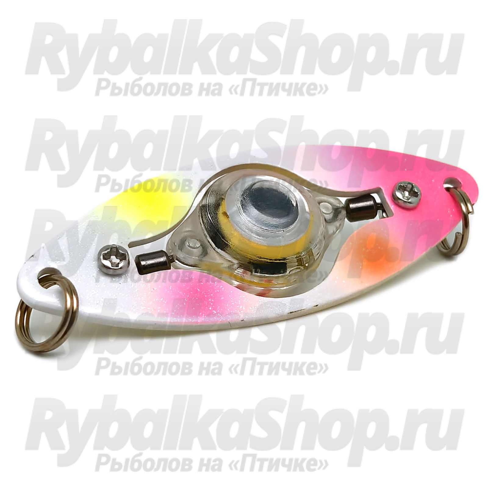 Оснащена сменным светодиодным 3D-глазом, мигающим при попадании в воду, что значительно активизирует клёв.