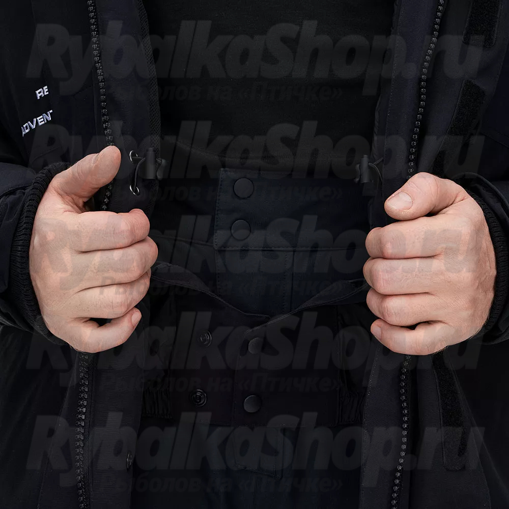 - Центральная двухзамковая тракторная молния с двумя ветрозащитными планками на велкро для 100% защиты от продувания.