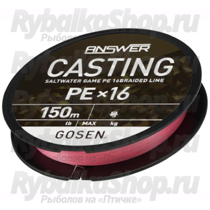 Gosen Answer Casting PEx16 - 16-жильная плетёная леска имеет необычайно гладкую поверхность, увеличивая дальность заброса. Изготовлена из более тонких PE волокон по фирменной технология Gosen «SG processing», обеспечивающее более плотное плетение, чем у 8-жильной, и повышает структурную устойчивость и прочность. Розовый цвет способствует отличной видимости в любых условиях, как днем, так и ночью.