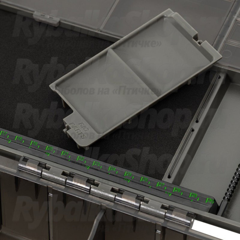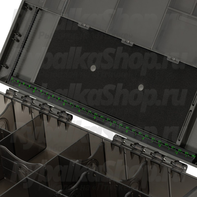 В крышке есть съемный лоток для временного хранения мелких компонентов оснастки, таких как крючки, бусины и вертлюги. Просторное основное отделение оснащено регулируемыми разделителями. Универсальные съемные разделители позволяют бесконечно настраивать пространство.