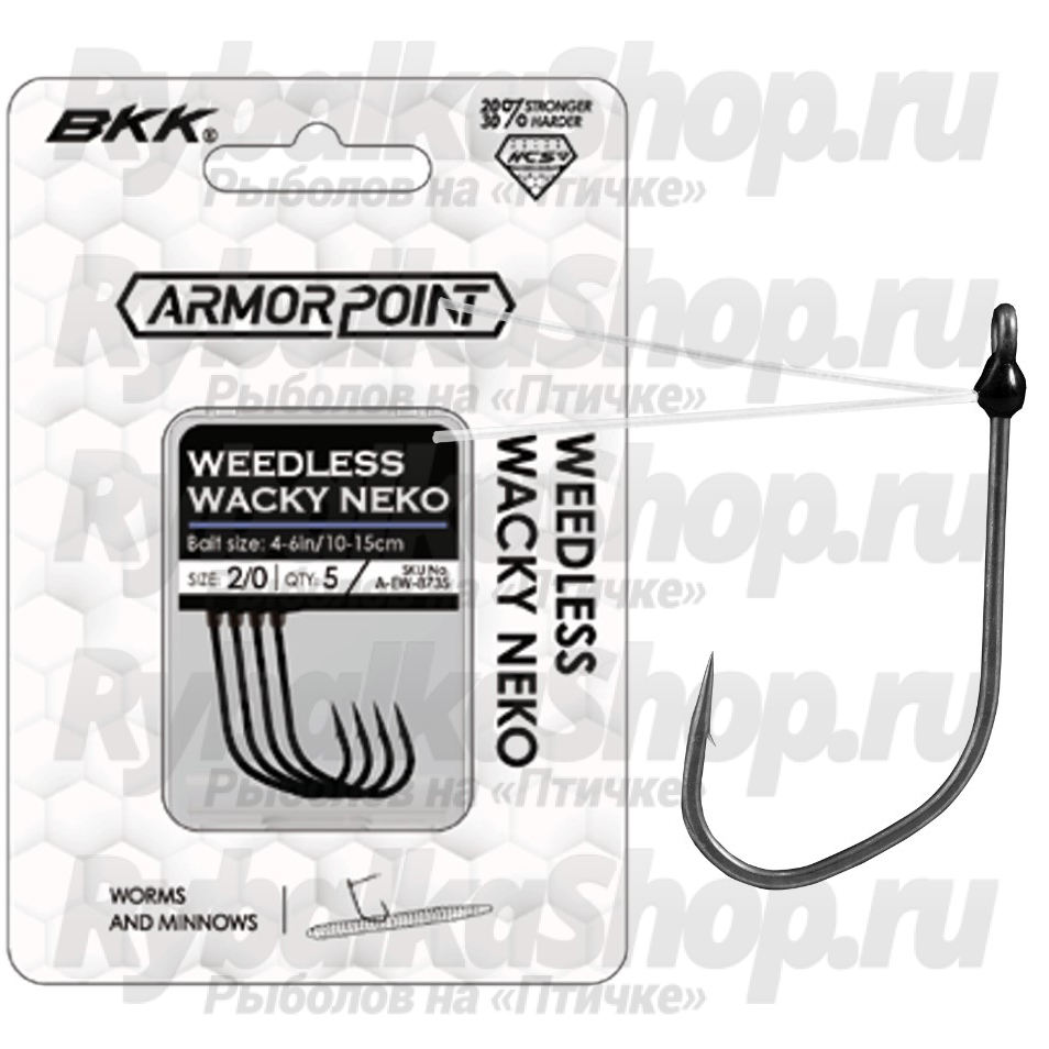 BKK Armorpoint Weedless Wacky Neko – специализированный одинарный крючок, разработанный специально для оснастки вэки и ловли в сложных условиях. Благодаря специальным усикам приманка может проходить сквозь заросли травы и другие препятствия без риска зацепа.
