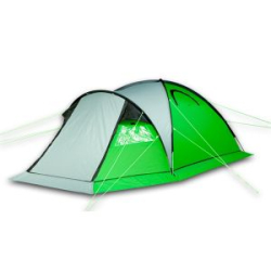 Внутренняя палатка так же имеет два входа: вы можете попасть в нее непосредственно из тамбура или с тыльной стороны палатки. Оба входа внутренней палатки (так же как и входы в тамбур) дублируются противомоскитной сеткой и ветро/водозащитными шторками. В жаркую погоду вы можете раскрыть все входы и палатка у вас будет полностью проветриваться. Кроме того, для улучшения вентиляции в куполе тамбура (когда на улице дождь, а вы решили приготовить что-нибудь на плитке) имеются два треугольных отверстия с противомоскитной сеткой. Сверху вентиляционных отверстий - защитный фартук, предотвращающий попадание воды через эти отверстия во время дождя. В случае прохладной погоды вы можете закрыть эти отверстия специальными шторками. На боковых стенках внутренней палатки располагаются сетчатые кармашки для мелких предметов. По обеим сторонам от центрального входа в тамбур есть два больших треугольных окна из прозрачного пластика, внутри закрывающиеся шторками. При открытых шторках это добавляет освещенности тамбура.