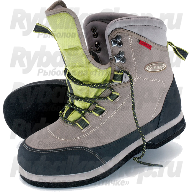 Ботинки очень легкие и напоминают обычную туристическую обувь. Они сделаны из прочного нейлона с усиленным резиновым носком. Благодаря широкой передней части ботинки легко надеваются, и в то же время прочные нейлоновые петли для шнурков обеспечивают хорошую фиксацию ноги. Амортизирующие неопреновые вставки обеспечивают высокий комфорт и надежность. Ботинки Vision Hopper выпускаются с войлочной подошвой и резиновой Vibram Idrogrip с шипами.