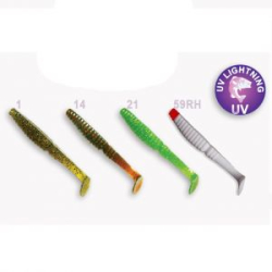 представляет собой удлиненное, слегка ребристое тело в виде червя, с хвостовым раздвоением на конце. Такая приманка рассчитана на использование с различными вариантами монтажа, и единственное ограничение, что крючок должен быть тонким и одинарным. Сама по себе приманка пассивная, со слабой положительной плавучестью. Но малейшие манипуляции с удилищем оживляют ее, достаточно просто посмотреть представленное ниже видео, чтобы убедиться в этом. Приманка с великолепной реалистичностью "обхаживает" подводную растительность, и даже зная, что она искусственная, все равно кажется, что это живой организм. И неудивительно, что хищник думает так же, и атакует ее. Вариантов раскрасок имеется с десяток, в упаковке 12 штук.