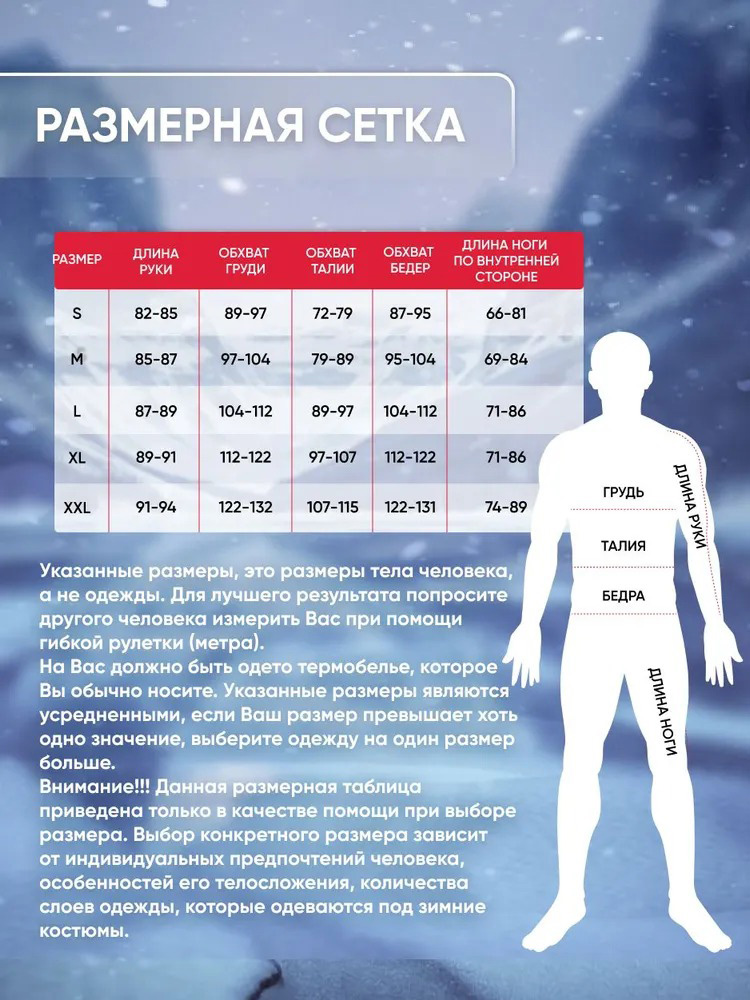 Костюм имеет большое количество карманов, куртка костюма оборудована снежной юбкой, есть регулировка длины брюк полукомбинезона. Чтобы быстро вытереть руки во время зимней рыбалки, в комплект костюма входят два небольших полотенца, которые можно закрепить на нижних карманах комбинезона.