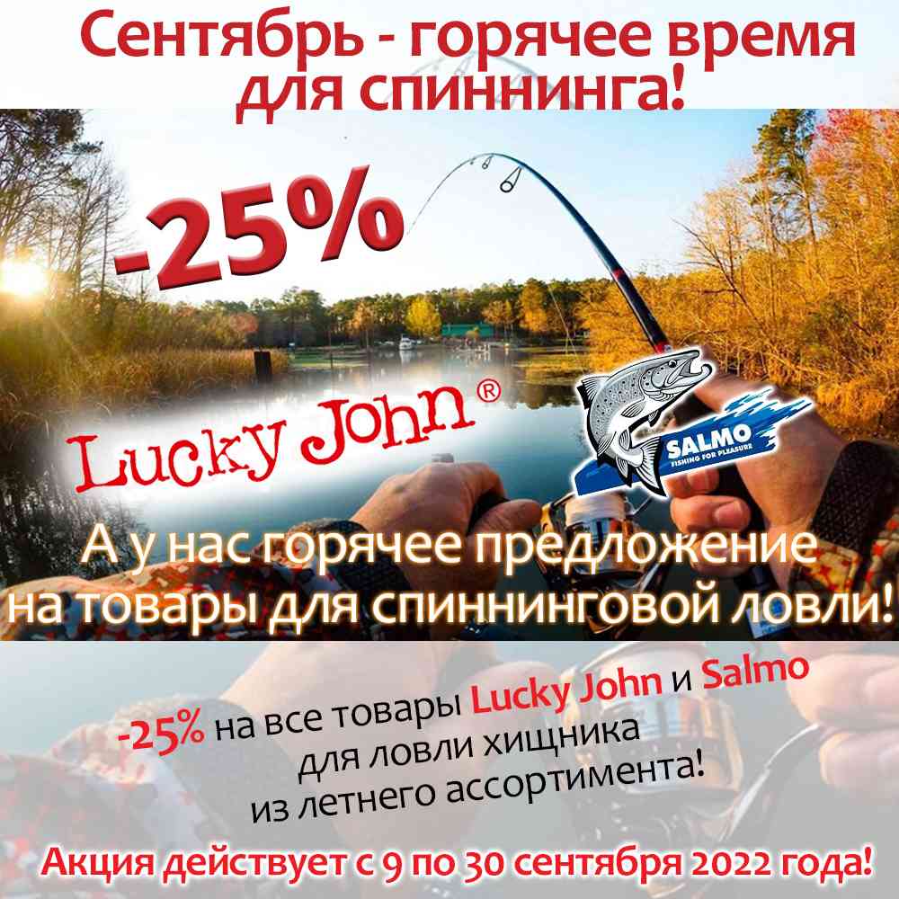 Уважаемые рыболовы! В нашем интернет-магазине беспрецедентная акция для любителей спиннинговой рыбалки!Сентябрь - горячее время для спиннинга!А у нас горячее предложение на товары для спиннинговой ловли!-25% на все товары Lucky John и Salmo для ловли хищника из летнего...