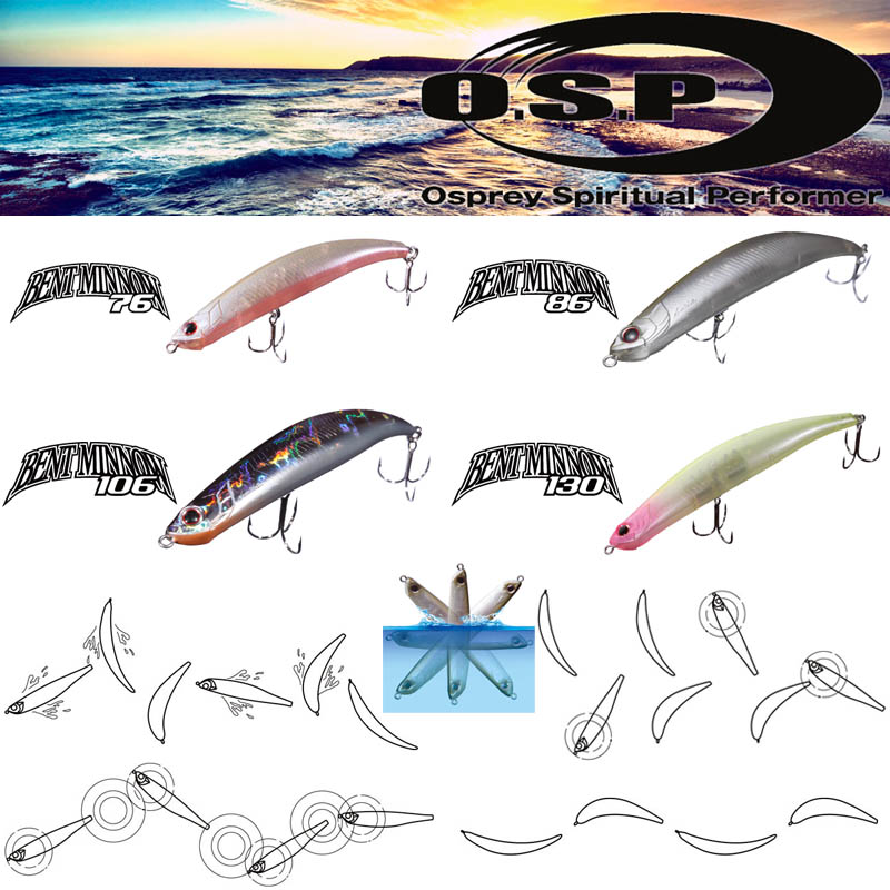 Уважаемые рыболовы, представляем Вашему вниманию совершенно уникальную, безлопастную приманку с искривленной осью и смещенным набок центральным тройником - воблер OSP Bent Minnow. По внешнему виду напоминает уклейку, с таким же прогонистым телом. А если брать сам класс, то эта приманка занимает промежуточное положение между топ вотерами и минноу. Выпускается в нескольких размерах от 76 до 130 мм. За счет искривленной конструкции, при рывковой проводке совершает рыскающие движения, причем не только по горизонтали, а и в вертикальной плоскости, при этом не сбиваясь с работы. Такие движения очень нравятся щуке, и как результат можно наблюдать очень частые ее поклевки. Рекомендуем посмотреть представленный ниже видео обзор ловли на этот воблер. Он хорошо демонстрирует, что приманка работает просто изумительно! Причем тестирование проводилось в осеннее время, и несмотря что щука бывает очень вялой в этот период, эту приманку она атакует систематически и часто.