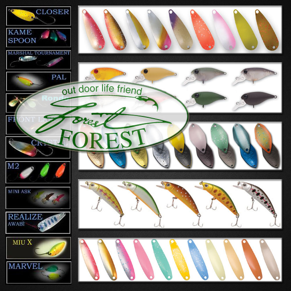 Дорогие друзья, в нашем магазине вас ждет широкий ассортимент приманок от японского производителя Forest. Данный бренд известен, прежде всего, как производитель форелевых блесен и воблеров на форель. Так в линейке продукции Форест имеются тонущие рыболовные воблеры типа минноу, разработанные исключительно для ловли форели в быстрых реках, классическая блесна Forest MIU 2014, идеально подходящая для тех любителей рыбалки, которые только начинают приобщаться к ловле форели на спиннинг, классическая форелевая блесна Форест PAL, а также иная продукция, которая будет не заменима для ловли форели и других видов рыб.