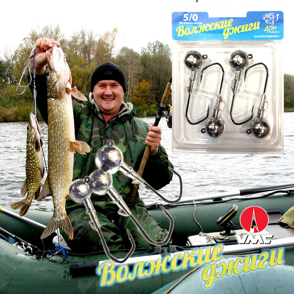 Возвращаясь к комплектам Волжских джиг-головок VMC Barbarian, хотелось бы отметить их особенности и преимущества. "Волжские Джиги" изготавливаются в индивидуально созданных формах на высокоточном оборудовании. Они откалиброваны и имеют логотип ZG. Эти джиг-головки начали изготавливаться более 10 лет назад, изначально в небольших количествах и применялись в основном спортсменами для ловли на реке Волга крупной рыбы с лодки, в особенности - судака. "Волжские Джиги" имеют одну уникальную особенность строения – ушко джиги выходит под углом 120 градусов, а не строго вверх под прямым углом, как это бывает в большинстве джиг-головок. При проводке это позволяет приманке плавно отрываться от дна, придавая траектории более мягкую горизонтальную составляющую, ваш твистер словно «парит» в толще воды, сводя с ума даже осторожную и сытую рыбу! А также подобное строение позволяет делать более результативную подсечку. Джиг-головки оснащены крючками VMC Barbarian которые имеет угловатую форму, что позволяет хорошо удерживать приманку и выдерживать большие нагрузки. Такой крючок прекрасно пробивает жесткую пасть крупного судака, щуки, сома и, как показывает практика, процент сходов – минимален.