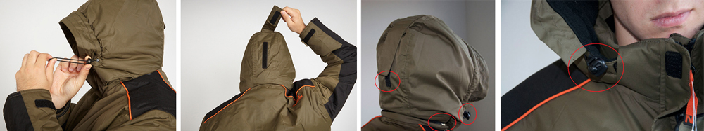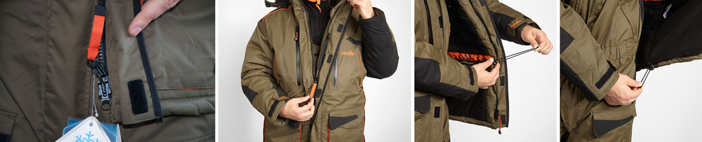 Традиционно у всех костюмов Norfin проклеенные швы, что предотвращает протекания внутрь. Основной молнией служит двухзамковая застежка-молния YKK с клапаном. Капюшон крепится с помощью замка-молнии и имеет двухуровневую регулировку, что позволяет максимально удобно зафиксировать капюшон на голове и точно подогнать по размеру. По всей передней кромке, пришит козырек-шторка, которая защитит лицо от осадков и снега при боковом ветре.