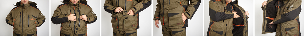 На куртке зимнего костюма Norfin Discovery имеется много карманов. Два нагрудных кармана снабжены влагозащитными застежками-молниями. Еще один внутренний нагрудный карман находится под клапаном основной передней застежки-молнии. На уровне груди – два теплых кармана для согрева рук. Для надежного хранения документов, предусмотрен внутренний карман куртки, закрывающийся застежкой-молнией, также внутри куртки справа расположен отдельный карман для мобильного телефона (навигатора) и сетчатый карман для рыболовных аксессуаров. В области бедер расположены два вместительных накладных кармана с клапанами на «липучках» Velcro. Под каждым из них находится еще по карману с боковым входом – в них, во время рыбалки, удобно кратковременно складывать рукавицы.