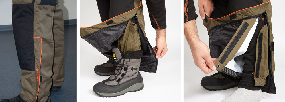 Регулируемая нижняя часть штанов с застежкой-молнией максимально удобна для носки полукомбинезона поверх ботинок, она также позволяет снимать полукомбинезон не снимая обуви. Внутренние снегозащитные гетры защитят от попадания снега в обувь при сильном ветре и при передвижении по высокому снегу.