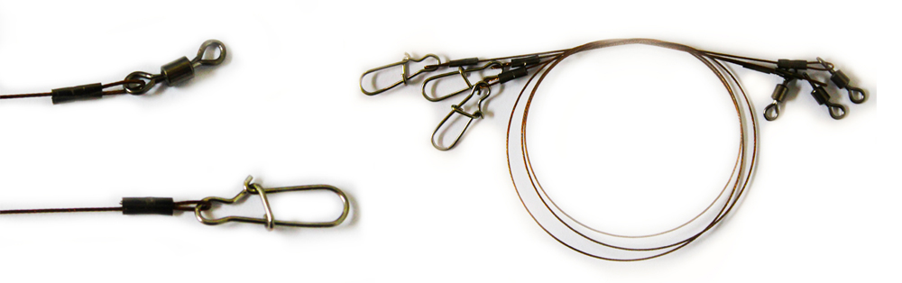 Поводок изготовлен из специального, высококачественного никель-титанового сплава. Он практически не подвержен деформации, более гибкий и легкий. Скрутка позволяет присоединять приманки без использования застежек. Кембрик не только предотвращает попадание шнура и травы, но и не дает скрутке расплетаться.