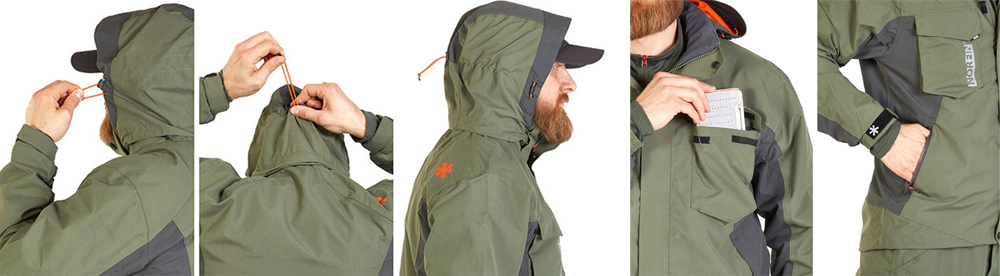 Капюшон куртки имеет двухуровневую регулировку, что позволяет точно подогнать его под размер головы. Анатомичный крой и встроенный козырек придают дополнительный комфорт во время использования. Передние части капюшона крепятся к воротнику куртки в специальных кармашках при помощи кнопок. Такое крепление делает соединение капюшона с курткой очень практичным, капюшон не выглядит как отдельное звено.