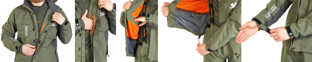 Куртка имеет четыре внешних кармана: два боковых, на застежках-молниях с ветрозащитными планками, и два объемных нагрудных, с клапанами на липучках «Velcro». А так же два внутренних кармана на застежках-молниях для документов, мобильного телефона и прочих важных мелочей.