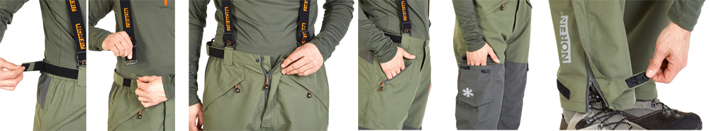 Брюки костюма Norfin Alpha имеют свободный крой. В поясе реализованы эластичные вставки для регулировки объема талии с помощью липучек «Velcro». Для комфорта в использовании, а так же для защиты области поясницы от ветра, штаны выполнены в форме полукомбинезона, с регулируемыми эластичными лямками. При необходимости лямки можно отстегнуть.