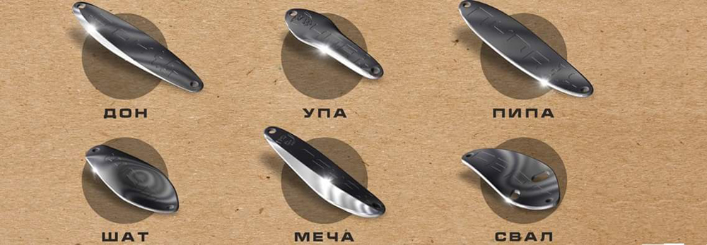 Первая линейка блесен «Кормовые базы» включает 6 моделей - Свал, Шат, Пипа, Упа, Дон и Меча, каждая из которых имитирует определенный кормовой объект для хищника и имеет свои особенности.