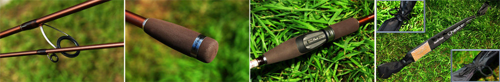 Принципиально серия спиннингов Nordic Stage Cheater делиться на два подкласса: короткие, назначение которых 100% твитчинг и более длинные модели от 722L, с возможностью ловли не только рывковой проводкой. Это не значит, что более короткими моделями нельзя ловить джигом или вращающимися блеснами, но визуально по вершине отследить падение приманки на дно будет сложно, да и далеко забросить колообразным спиннингом вертушку не так-то просто. У более длинных моделей вершина чуть мягче и позволяет реализовывать концепцию единого спиннинга на водоеме, с основным упором в твитчинг.