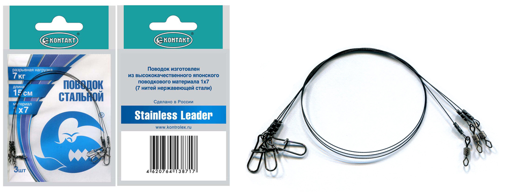 Компания Контакт выпустила новую линейку стальных поводков 1х7, которые представлены в широком ассортименте. Тесты на разрывную нагрузку: 7, 10 и 13 кг. Длина поводков: 15, 20 и 25 см. В упаковке 3 поводка.
