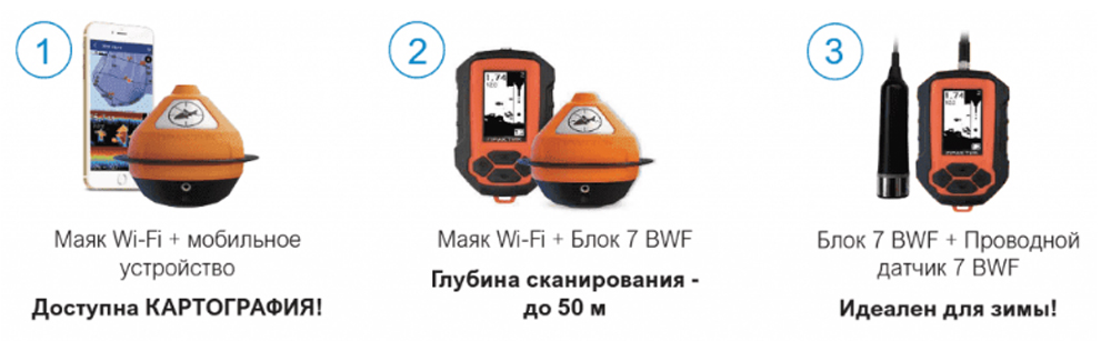 Беспроводной датчик-преобразователь "Маяк" транслирует информацию на блок "7 BWF" или смартфон/планшет посредством WI-FI-соединения. При использовании смартфона сначала необходимо установить на него соответствующее бесплатное программное обеспечение - мобильное приложение "Эхолоты Практик 7" для Android или IOS. Проводной датчик используется в соединении с блоком 7 BWF. Питание от аккумулятора, встроенного в блок.