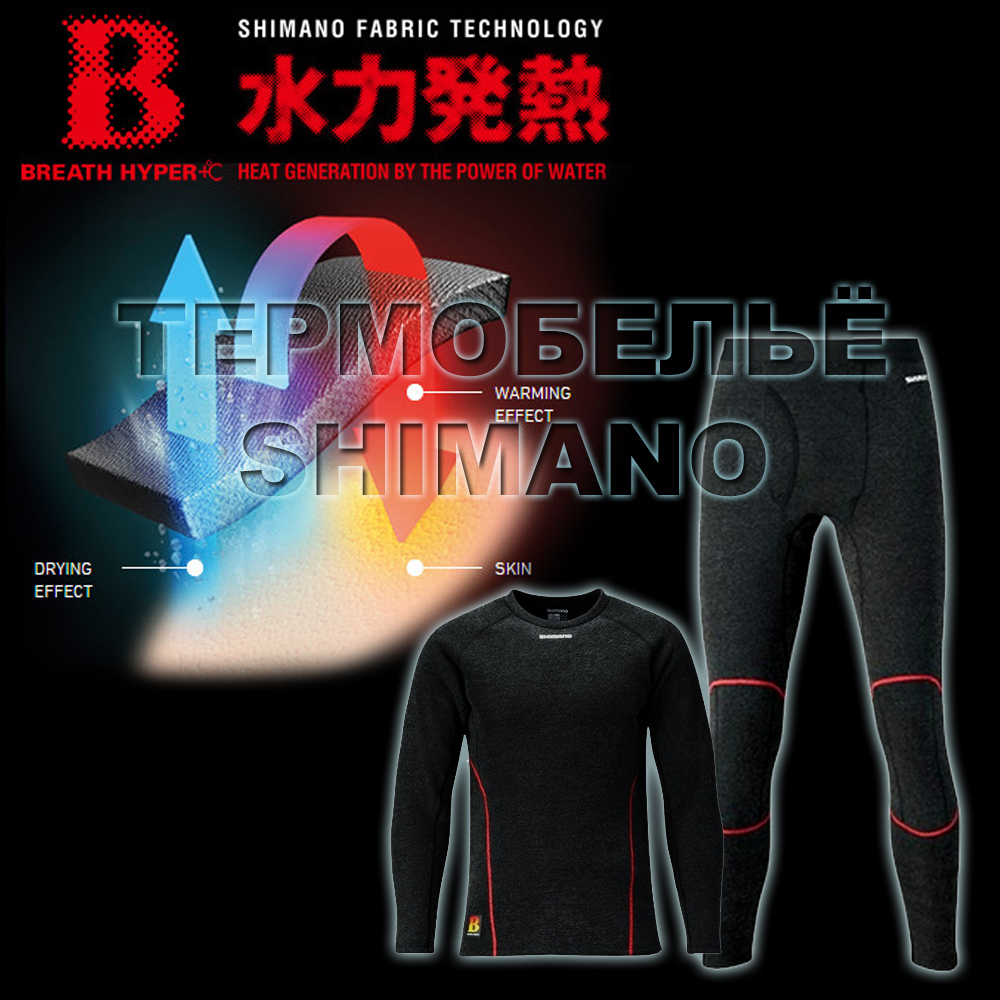 Сегодня же, мы бы хотели подробнее остановится на новинках нашего каталога термобелье из серии Shimano Breath Hyper+C. Это высококачественное термобелье, изготовленное из специального материала, с уникальным свойством (Hydro-Heather) - преобразования влаги, выделяемой телом, в тепло. Особенность материала этого термобелья можно описать как «гидрообогреватель», который превращает выделенную вашим телом влагу в тепло. В итоге, с использованием этого термобелья под одеждой, Вы получите тепловой эффект на 2-3º выше и на 20% меньше влаги. Материал создан для плотного прилегания к телу без ограничения свободы движения. Антибактериальные особенности материала препятствуют развитию бактерий и уменьшают запах пота. Также это термобелье не создает статического электричества. Shimano Breath Hyper +C специально создано для самых холодных погодных условий. Это термобелье можно использовать с осени по весну.