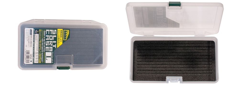 Meiho Slit Form Case — семейство коробок для рыболовных приманок, крючков и джиг-головок с вкладышем из пористого полиэтилена (Polyethylene). Приманки закрепляются в коробке посредством фиксации крючков в специальных прорезях вкладыша. В прорези крючки легко входят и выходят, не цепляя материал вкладыша.