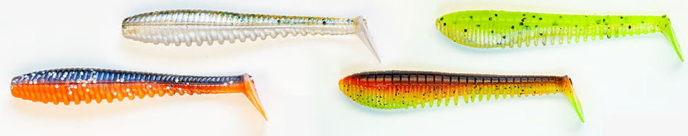 При проводке игра приманки выглядит крайне реалистичной как при медленных стилях анимации, так и при скоростных. Хвостовой плавник воспроизводит колебания, способные акцентировать внимание хищной рыбы. Ну, а ребристая структура тела добавляет еще больше естественных нюансов на поведение виброхвоста при проводке, а также благодаря ребристой структуре тела приманка быстрее «заводится» и гораздо податливее ведет себя в воде.