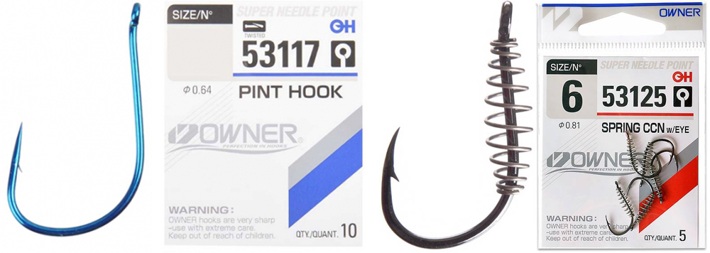 Крючки Owner 53117, предназначенные специально для ловли леща на донные и поплавочные снасти. Отличаются широким круглым загибом, острейшим жалом и чуть отогнутым внутрь колечком для привязывания. Также для них характерно покрытие синего цвета, менее заметное для рыбы, особенно на приличной глубине.