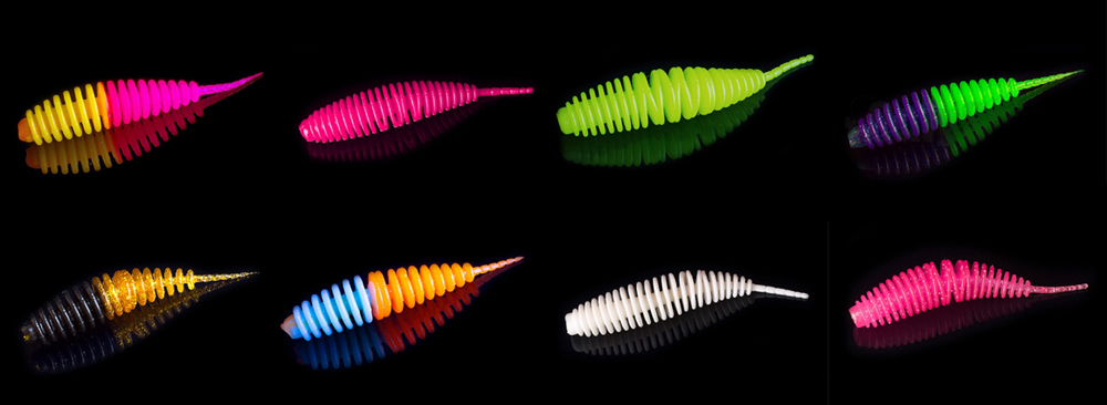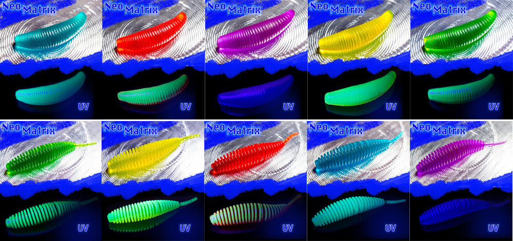 Кроме того, появились новые цвета Neo Matrix в моделях Mirax 50, Mirax 70, Bruchi 40. Эти цвета отличаются очень насыщенным свечением в ультрафиолете, что однозначно положительно влияет на клев и является уникальным среди силиконовых приманок.