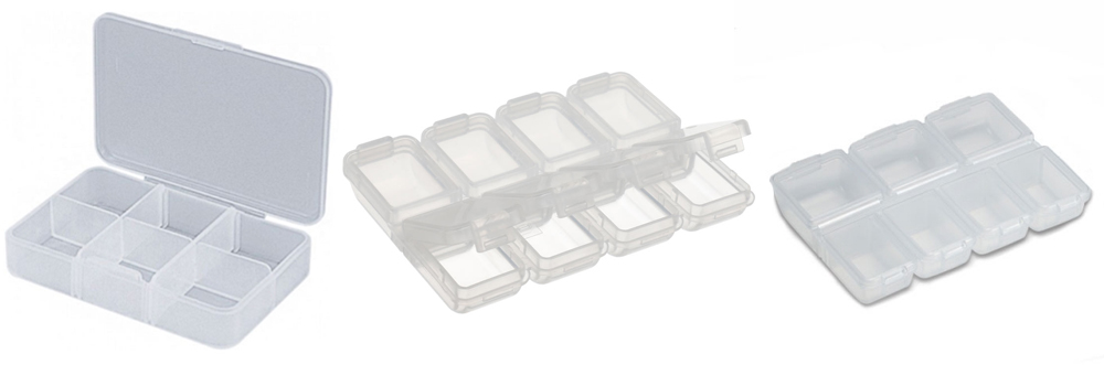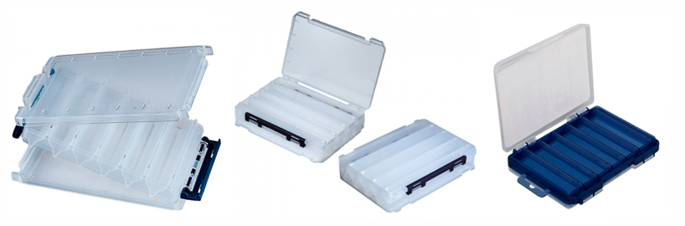 Также есть универсальные легкие прозрачные коробки из ударопрочнного пластика. Они имеют прочную и надёжную защёлку, легко оперировать одной рукой. Дизайн "сглаженных углов" для более лёгкого вхождения коробки в рыболовную сумку. Коробки имеют большое количество съёмных перегородок с системой "микро шага" Meiho Micro Rib System, благодаря чему универсальны в применении.