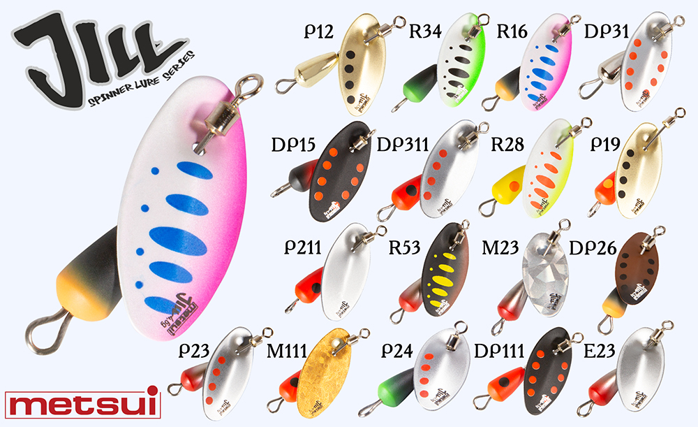 Кроме того, в ассортименте Metsui есть и вращающиеся блесны - на сегодняшний день вращалки представлены одной серией Metsui Jill. Блесна Jill представлена в трех типоразмерах и насчитывает 18 вариантов расцветки.