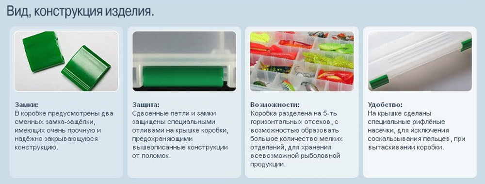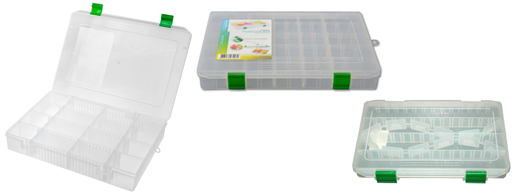 Возможности: Коробки разделены на горизонтальные отсеки, с возможностью образовать большое количество мелких отделений, для хранения всевозможной рыболовной продукции.