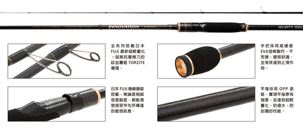 Бланки для серии Hearty Rise Innovation производятся по методике Net-V третьего поколения из топового японского препрега от концерна Mitsubishi, предлагающего лучшие на данный момент графитовые материалы. Модульность углепластика составляет 46 тонн. Феноменальный показатель, благодаря которому удилища получились максимально быстрыми, строгими и «звонкими». Проблема хрупкости спиннингов из сверхвысокомодульного графита решена за счет использования дополнительной углеволоконной сетки, упрочняющей снасть и делающей ее менее чувствительной к ударным нагрузкам.