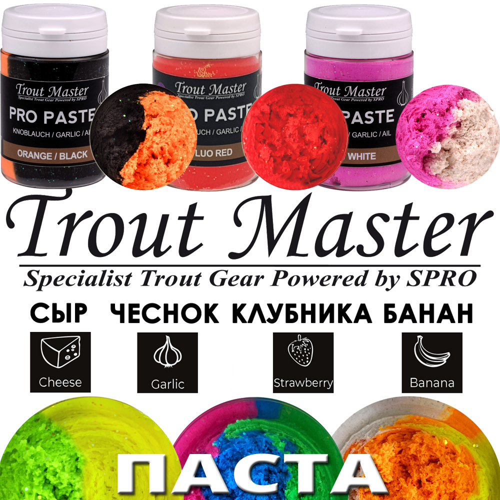Преимущество форелевой пасты Trout Master Pro Paste заключается в разнообразии вкусов, манипулируя которыми можно подобрать оптимальную насадку для конкретных предпочтений хищника. Купить пасту Trout Master Pro Paste можно со вкусом сыра, чеснока, банана и клубники.