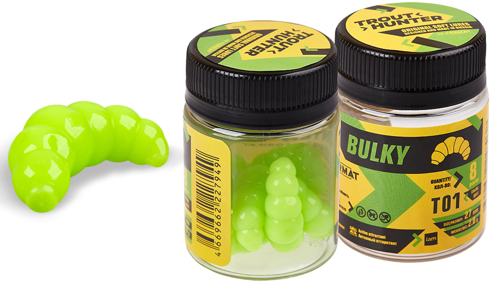Так, приманка IAM Trout Hunter Bulky — это интерпретация широко известной и популярной формы личинки. Хорошо проработанная, ассиметричная форма приманки вместе с рассчитанным изгибом тела делают игру этой приманки очень активной и неповторимой, причем как на падении, так и на равномерной проводке.