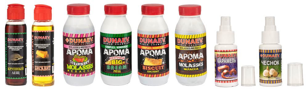 Дополнительно в прикормочные смеси вводятся жидкие ароматические добавки - дипы и аттрактанты Dunaev. Они позволяют усилить или изменить базовую ароматику смесей. Главным показанием к использованию концентрированных добавок является необходимость усилить запах прикормочной смеси и при этом не изменить ее механических свойств.