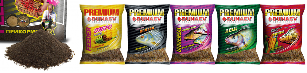 Смеси Dunaev Premium - крупнофракционные и рассчитаны на ловлю карпа. Фракция помола 0,3-2 см. В прикормке попадаются кусочки бисквитов до 2-3 см. Прикормка очень клейкая и почти не создает облака мути в месте ловли. Существуют варианты с различными карповыми ароматами (сладкая кукуруза, скопекс, подсолнечных жмых и др.) При замешивании в прикормку можно добавить консервированную кукурузу, вареного или живого опарыша, нарезанного червя. Данная смесь сочетается с озерными и речными прикормками.
