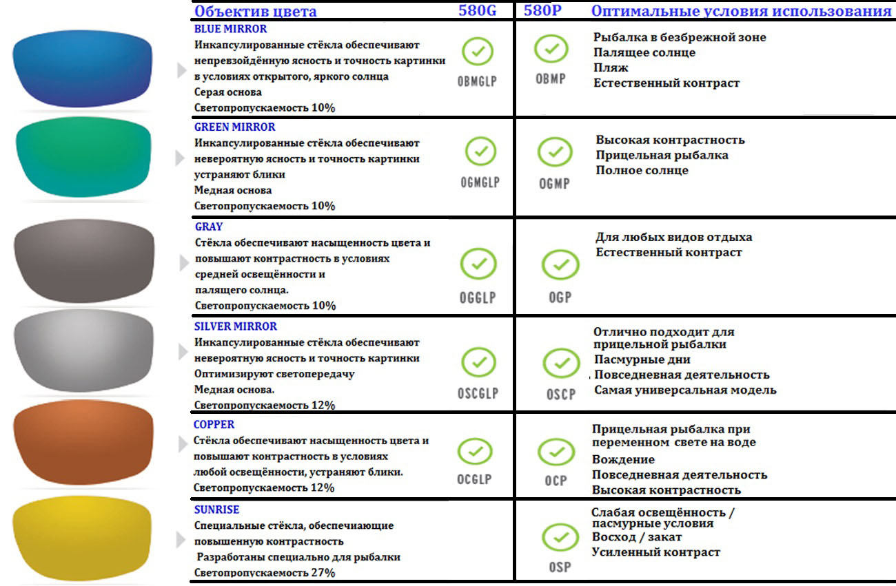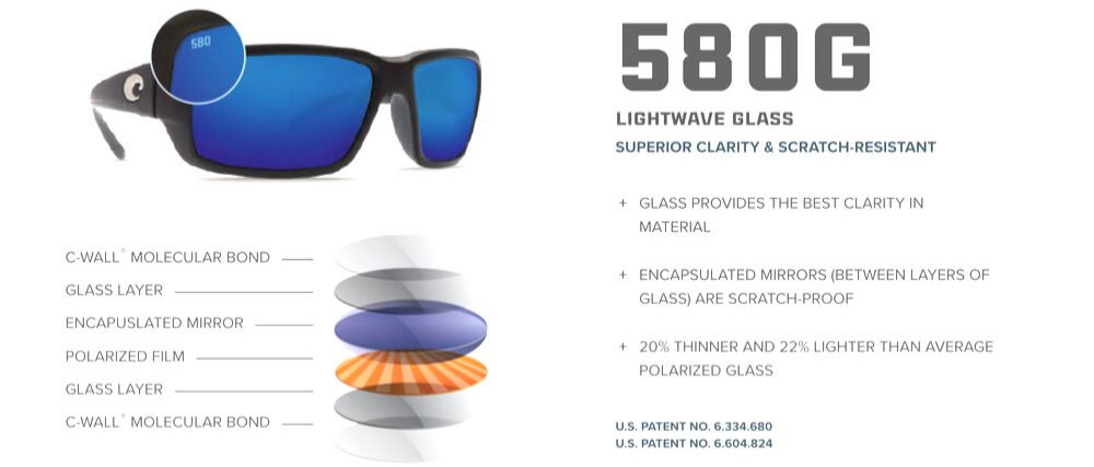 Благодаря запатентованной технологии фильтра Costa 580, блокируют спектр тяжелого для восприятия глазами желтого цвета на уровне 580 нанометров. Таким образом, даже на самой длительной рыбалке в яркий солнечный день или на льду зимой глаза не устанут и будут защищены и ультрафиолетовых лучей и бликов на 100%. Фильтр Costa 580 избирательно отфильтровывает резкий желтый свет и вредный, в высокой степени энергии, ультрафиолетовый синий свет, что делает цвета ярче, а предметы кажутся более определенными. Так как условия освещения постоянно меняются, компания Costa предлагает несколько цветов линз, которые варьируются от низкой освещенности как рассвет до очень яркого света с ослеплением.