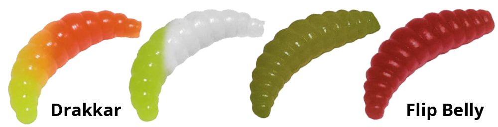 Мягкие приманки Drakkar 38 мм и Flip Belly 33 мм имитируют личинку насекомого и были специально разработаны для ловли форели в прудах и реках. Приманки сделаны из супер мягкого, но при этом прочного на разрыв силикона и имеют оригинальную форму тела, в состав которого внедрены специальные аттрактивные добавки.